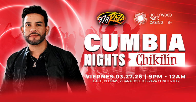 97.9 La Raza llega a Hollywood Park Casino para una Noche de Cumbia con Chikilin. Viernes 27 de Marzo de 9 pm. a 12 am.  ¡Tu oportunidad de ganar boletos y muchas sorpresas más! ¡Confirma tu asistencia en el formulario a continuación para informarnos que te unirás!